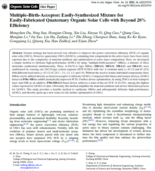 周二军团队在有机太阳能电池方向取得重要研究进展。相关研究成果以“Multiple-Birth-Acceptor : Easily-Synthesized Mixture for Easily-Fabricated Quaternary Organic Solar Cells with Beyond 20% Efficiency”为题,在化学类顶级期刊《Angew. Chem. Int. Ed.》上发表。这是我校首次以第一单位在该顶级期刊发表论文,第一作者为麻豆视频-麻豆视-麻豆视频av