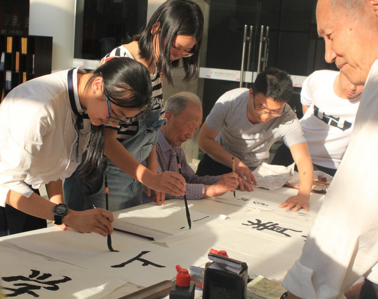 交流结束后,老爷爷们挥墨泼毫,书写了“开天辟地敢为人先的首创精神,坚定理想百折不挠的奋斗精神,立党为公忠诚为民的奉献精神”“雄关漫道真如铁,而今漫步从头越”等几十幅墨宝,展现了精湛的书法技艺,表达了对青年学子的勉励,以及对祖国繁荣昌盛的期望。